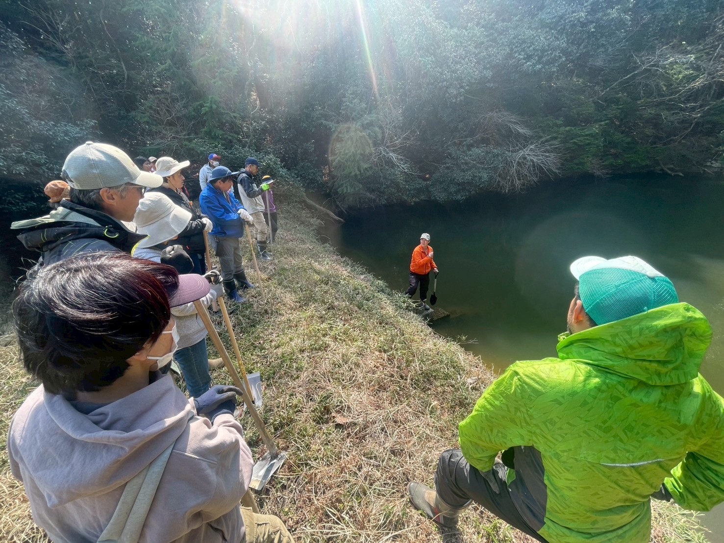 田んぼに引く水のため池。最初の作業は田んぼまで続く長い水路の泥上げ作業から!